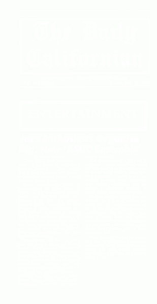 | current | 01:26, 6 December 2011 | 744 × 1,441 (41 KB) | Drlesmgolden (talk | contribs) | Les Golden of Oak Park Illinois, trumpet player, jazz vocalist, and announcer, writes article for Daily Californian in 1968 about first concert of the University of California Jazz Ensembles |