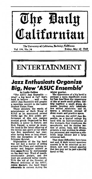 Les Golden of Oak Park Illinois, trumpet player, jazz vocalist, and announcer, writes article for Daily Californian in 1968 about first concert of the University of California Jazz Ensembles