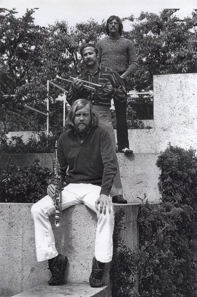 Members of the University of California Jazz Ensembles in a publicity photo prior to a performance at the Oakland Museum. From top, Gary Maas, drummer, now an optometrist, Les Golden, trumpet, vocalist, and announcer, of Oak Park, Illinois, and Larry Heavey, baritone sax, now a radiologist.