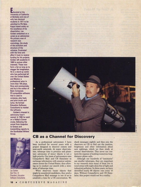 Leslie M. Golden, Les Golden, Ph.D, astronomer, professor, actor, comedian, musician, environmentalist, of Oak Park Illinois. His use of the internet to enlist amateur astronomers world-wide was heralded in an article in Compuserve Magazine, which also discussed his being a writer for the Syndicated Writers’ Group reporting as a Halley’s Comet lecturer on the high seas.